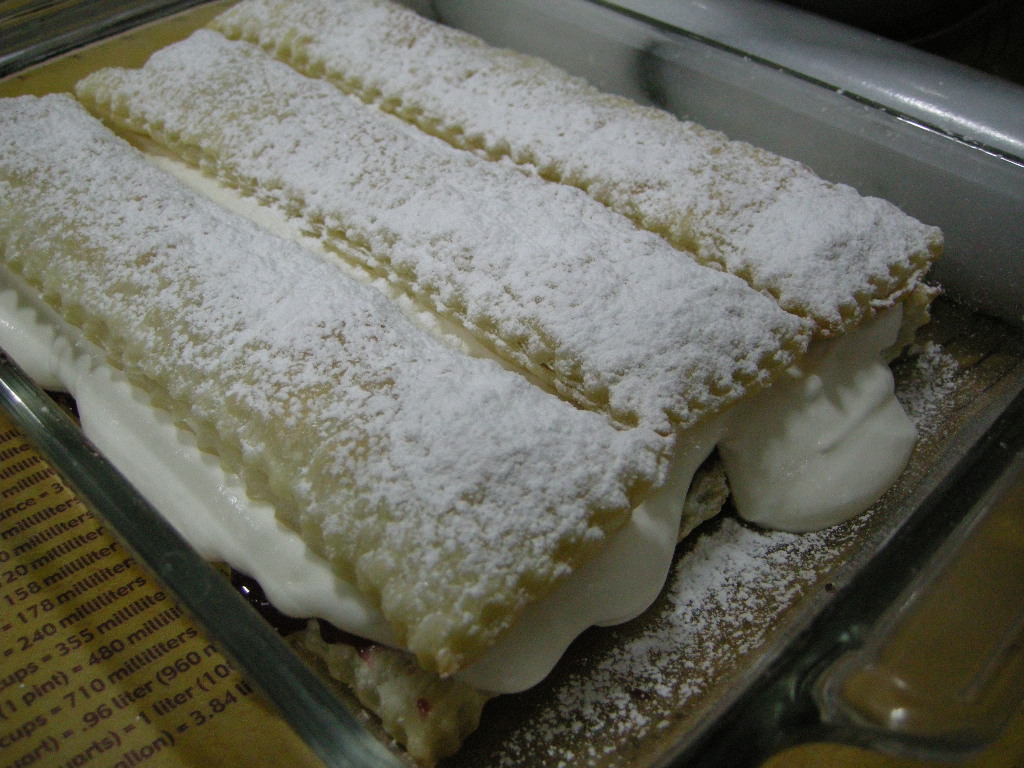 Line the bottom of a baking dish with three pastry strips. Slather (yes, slather) with raspberry jam (or any jam of your liking). Generously spoon and spread a layer of the pastry cream over the jam. Finally, place three more pastry strips over the cream layer and dust like a mad wo/man with icing sugar.