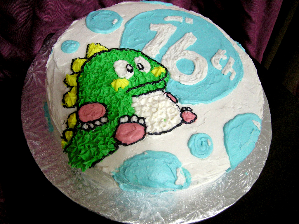 This commissioned cake features one of the most addictive games of my youth: Bubble Bobble.