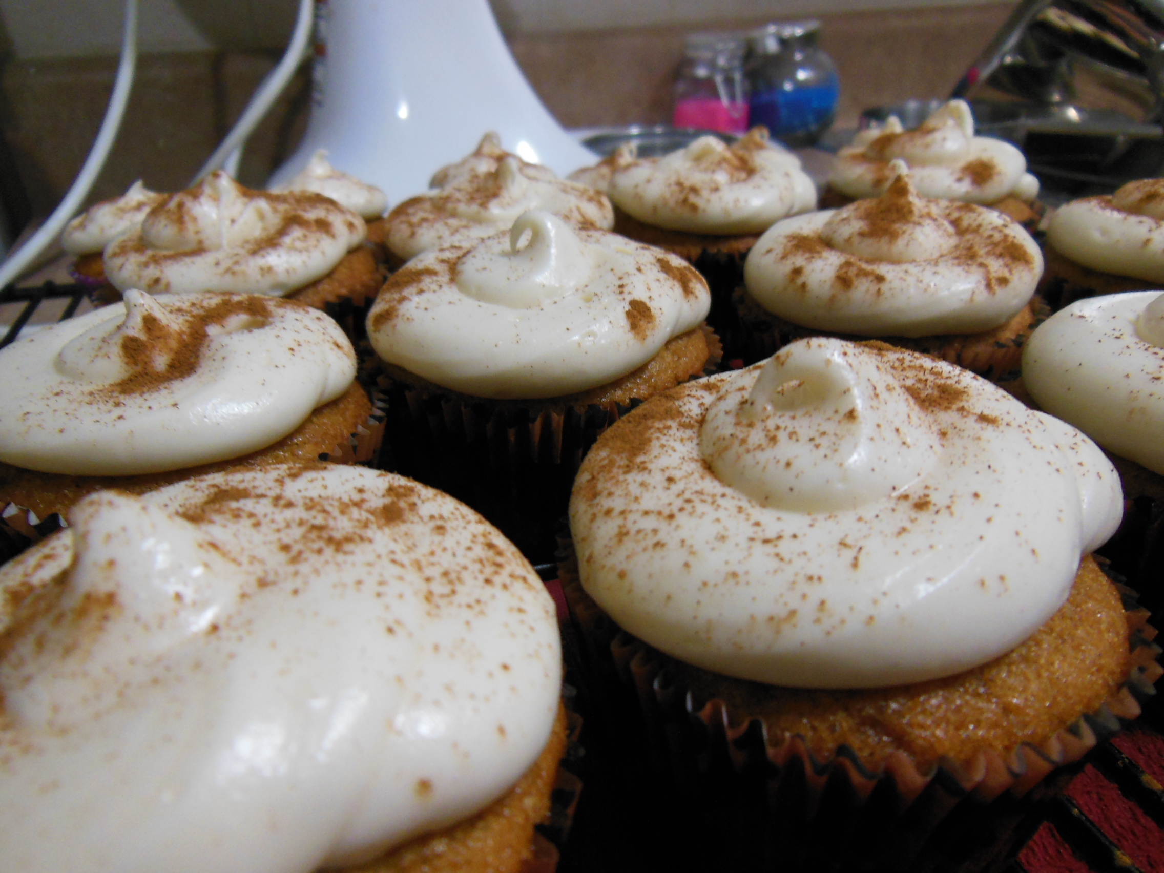 ‘Tis the season, my friends! Nope, not Christmas; not yet. It’s pumpkin flavoured stuff season! The recipe is here to the letter (though skip the bit about crumb-coating unless you’re actually making a cake!) I also tend to shave off a couple of minutes if I’m making cupcakes vs. cake as per the recipe. Enjoy!