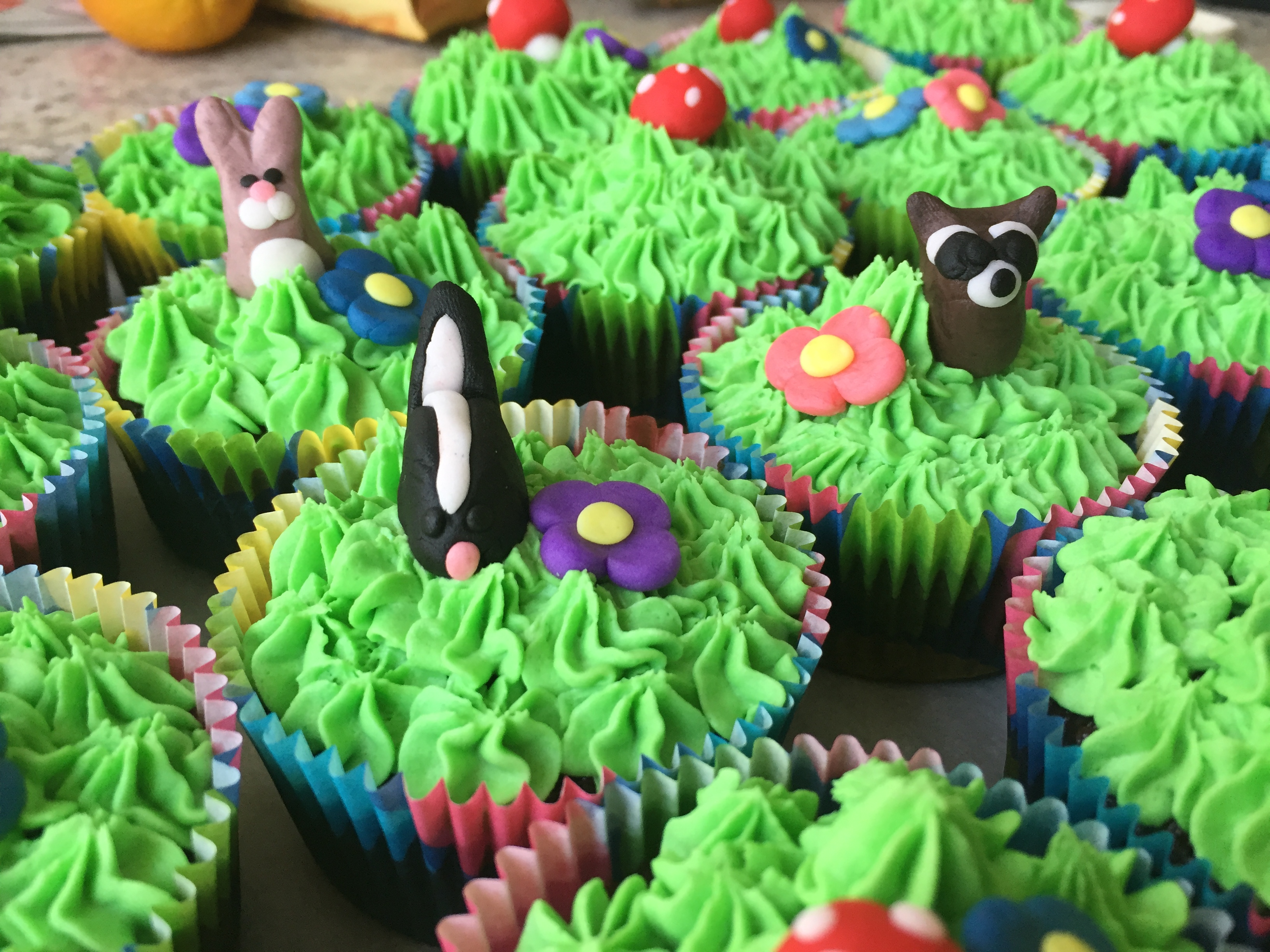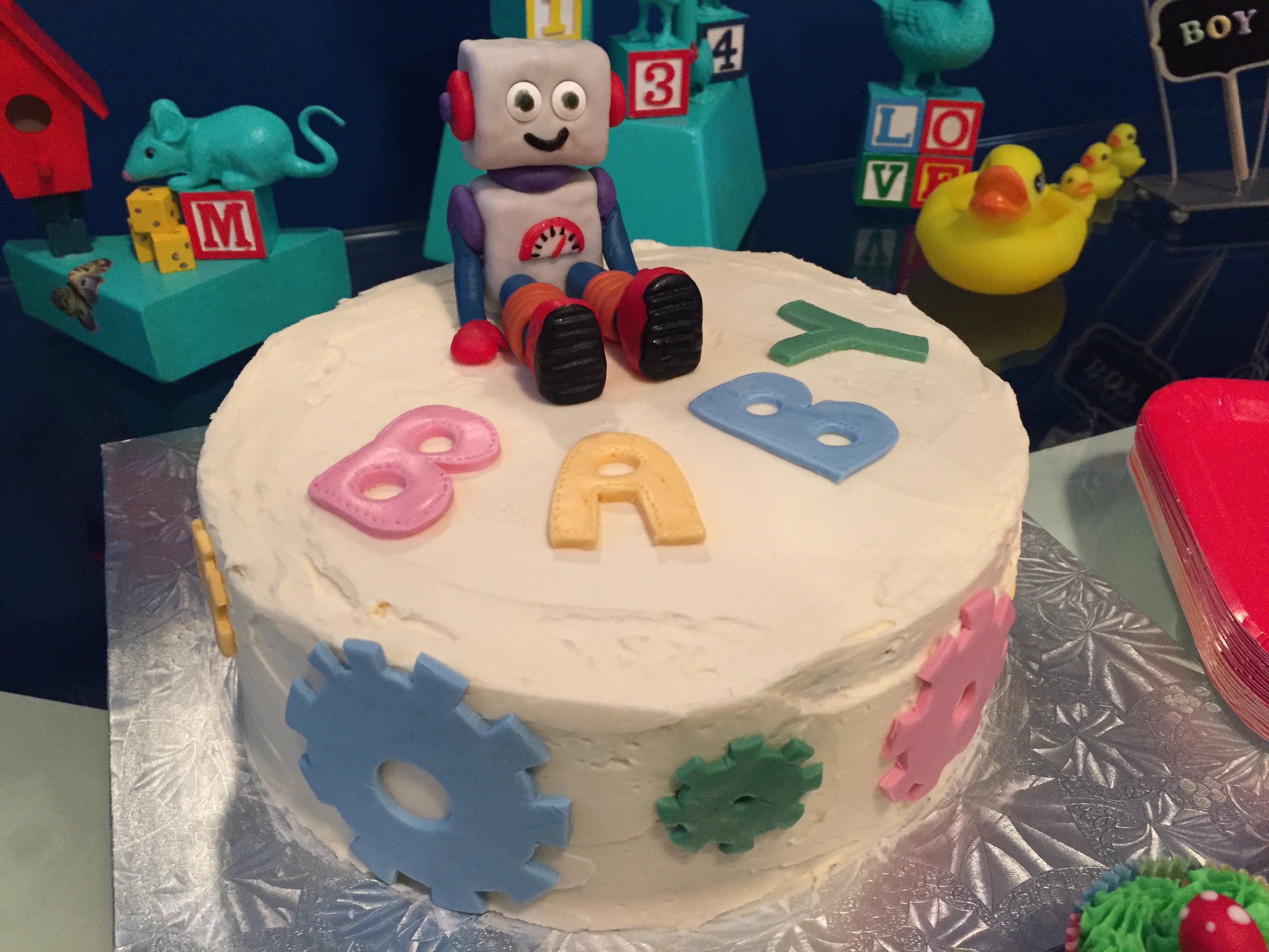 This juxtaposition is the result of not being able to decide on which theme to go with. When deciding between the two, my mind constantly wandered to The Iron Giant. The little robot is made of Rice Krispie covered in fondant, while the flowers, mushrooms, and tiny woodland creatures are just shaped with fondant.