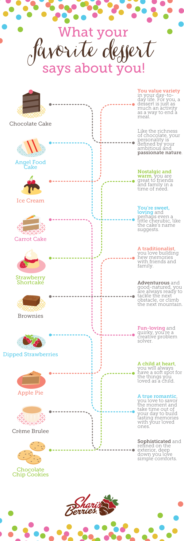 November 5, 2015 Michelle V What Your Favourite Dessert Says About You (source: Shari’s Berries) Share this: Click to share on X (Opens in new window) X Click to share on Facebook (Opens in new window) Facebook Like Loading... Related