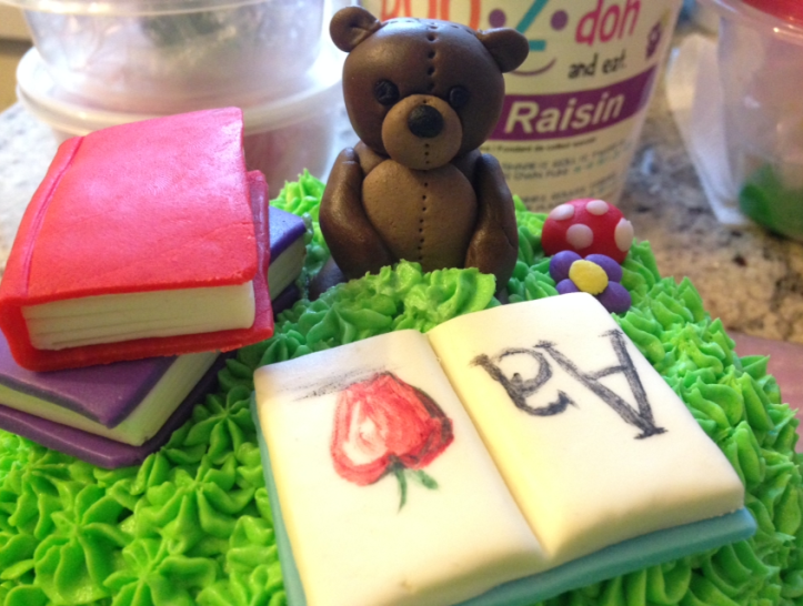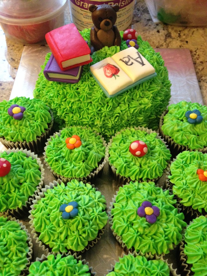 When your friends ask you to make a smashing cake with cupcakes for their little girl’s first birthday, it’s impossible to say no especially when the given criteria includes reading and animals. The result is a fun little cake featuring teddy bear on a grassy hilltop learning how to read.