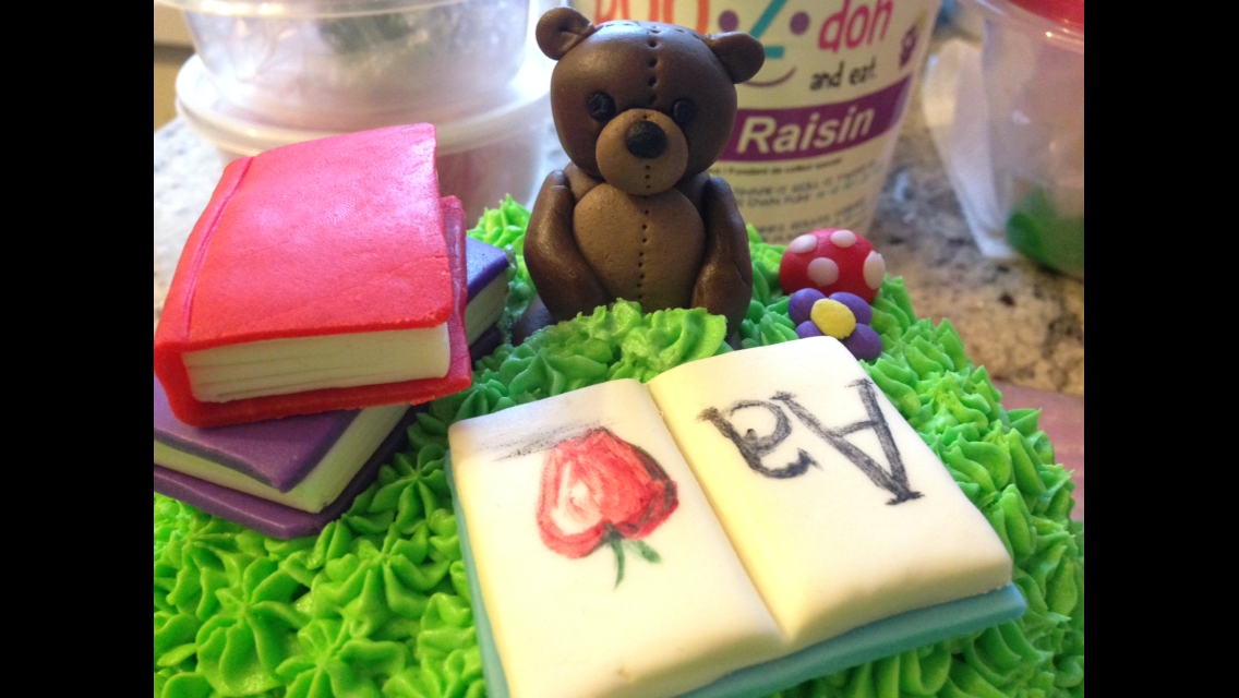 The studious bear was shaped using sculpting chocolate while the toadstools and flowers were made from fondant.